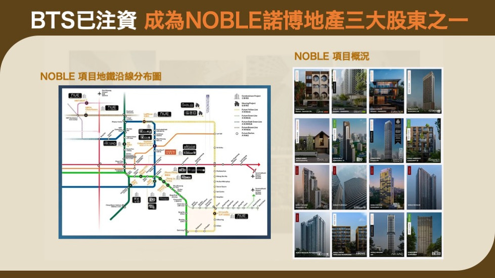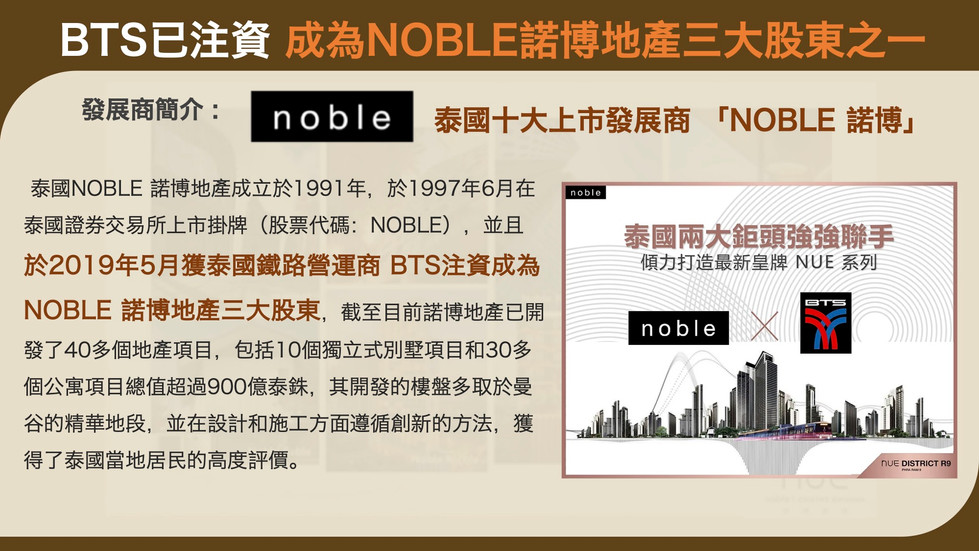 • 2019年5月泰國BTS鐵路注資成為Noble諾博地產三大股東之一。